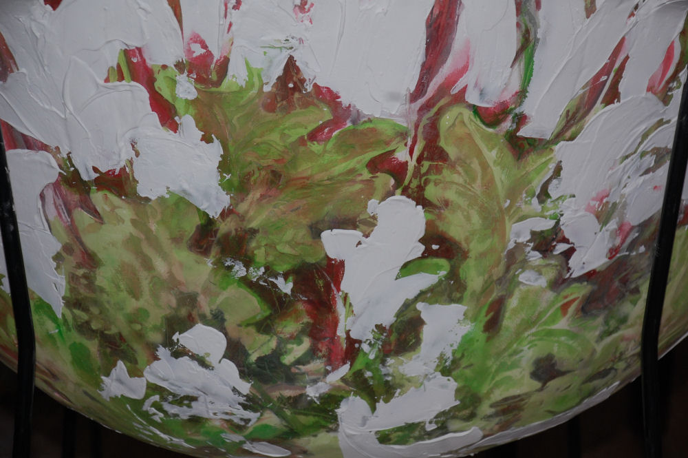 See more info about the chairs, upcycled from 1960’s plastic lawn chairs – blog posts detail work in progress on Sept 10th, 2015, Sept. 29th, Oct. 18th, and finished on Jan. 14th 2016. The chair is carved and painted underneath also.