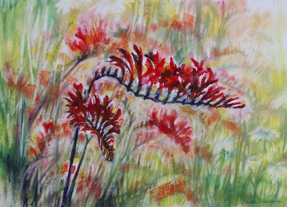 Crocosmia, 18H x 24W inches soft pastels on paper, framed size 27H x 33W” white mat and white wood frame with crackle finish.